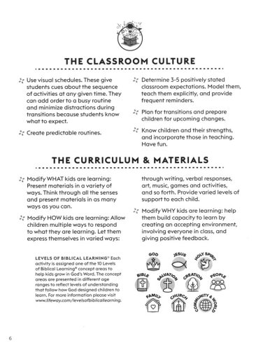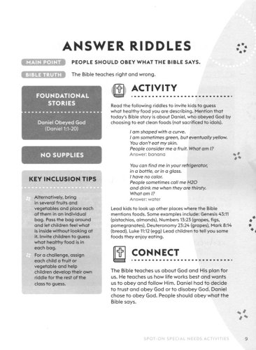 Create an inclusive ministry for special needs children engaging them in full participation with Spot-On Special Needs Activities. Based on the Levels of Biblical Learning® concept areas, these activities build a strong, biblical foundation with key inclusion tips. Additional helps include 10 Suggestions for Working with Families, a Topic Index, Foundational Stories Index, and Emergency Contacts pages. 120 pages; Softcover; 7.0" x 9.5".