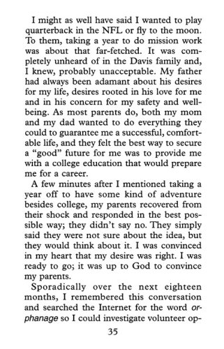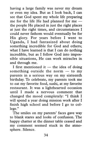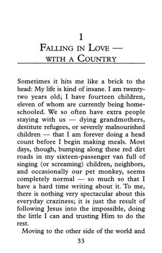 What would cause an eighteen-year-old old senior class president and homecoming queen from Nashville, Tennessee, to disappoint her family and friends all so she could move to Uganda, where she knew only one person but didn't know any of the language? A passion to make a difference. Katie Davis left over Christmas break her senior year for a short mission trip to Uganda and her life was turned completely inside out. She found herself so moved by the people and children of Uganda that she knew her calling was to return and care for them. Katie, a charismatic and articulate young woman, is in the process of adopting thirteen children in Uganda, and she completely trusts God for daily provision for her and her family.