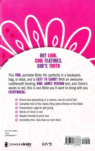 Complete text of the timeless King James Version of the BiblePresentation page allows you to personalize this special gift by recording a memory or noteWords of Christ in red allowing children to clearly notice passages spoken by JesusRibbon marker for kids to easily navigate and keep track of where you were readingEasy-to-read 8-point fontIncredibly thin trim size allows your child to carry this Bible anywhere with ease