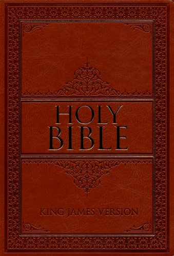 Stunning Tan Faux Leather Bound Large Print Edition King James Bible. The cover is constructed of quality man-made material imported from Italy, with the look and feel of real leather (trade name LuxLeather). Design features include an engraved filigree cover design on the front and back, gold foiled debossed title and accents, gold page edges with thumb indexing and an attached ribbon page marker. Inside, you'll find reader-friendly subheadings, a double-column format, a helpful Scripture verse finder by topic and a one-year Bible reading plan.