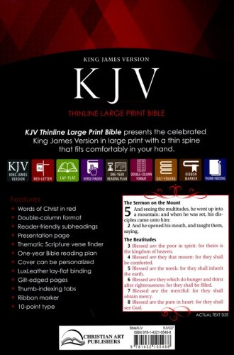 Gold page edges with thumb indexingFaux Leather- (LuxLeather) BoundUnique Scripture Verse FinderOne-Year Bible Reading PlanWords of Jesus in redLay-Flat SpineRibbon Marker10-point text size9.75" x 6.75" x 1.00"