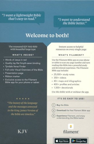 The new Tyndale KJV Personal Size Giant Print Bible, Filament-Enabled Edition has readable text and an attractive layout in an easy-to-carry size. And while it has the same low price as basic text-only Bibles, the KJV Personal Size Giant Print Bible offers much more. It not only features a bold new design and the trusted and revered King James Version (KJV) but also includes the groundbreaking Filament Bible app. This app enables you to use your mobile phone or tablet to connect every page to a vast array of related content, including study notes, devotionals, interactive maps, informative videos, and worship music.