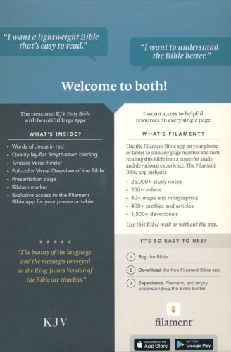 The new Tyndale KJV Personal Size Giant Print Bible, Filament-Enabled Edition has readable text and an attractive layout in an easy-to-carry size. And while it has the same low price as basic text-only Bibles, the KJV Personal Size Giant Print Bible offers much more. It not only features a bold new design and the trusted and revered King James Version (KJV) but also includes the groundbreaking Filament Bible app. This app enables you to use your mobile phone or tablet to connect every page to a vast array of related content, including study notes, devotionals, interactive maps, informative videos, and worship music.