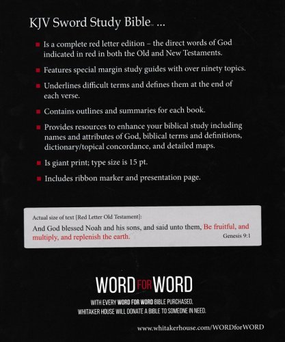 The KJV Sword Study Bible® contains many unique and distinctive features and resources, including the following:Words of God highlighted in red in the Old TestamentWords of Jesus highlighted in red in the New TestamentDifficult terms underlined and explained at the end of the verseThematic study guide with over three thousand margin notes covering more than ninety topics, providing a years’ worth of study that takes the reader through the Bible from cover to coverOutlines and summaries at the beginning of each bookExtensive treasury of biblical information on history, science, prophecy, and moreTopical concordance and mapsFifteen point, large print type size