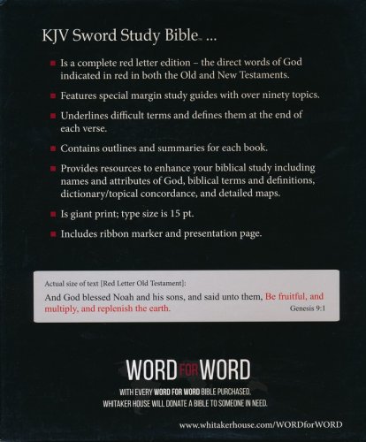 The KJV Sword Study Bible® contains many unique and distinctive features and resources, including the following:Words of God highlighted in red in the Old TestamentWords of Jesus highlighted in red in the New TestamentDifficult terms underlined and explained at the end of the verseThematic study guide with over three thousand margin notes covering more than ninety topics, providing a years’ worth of study that takes the reader through the Bible from cover to coverOutlines and summaries at the beginning of each bookExtensive treasury of biblical information on history, science, prophecy, and moreTopical concordance and mapsFifteen point, large print type size