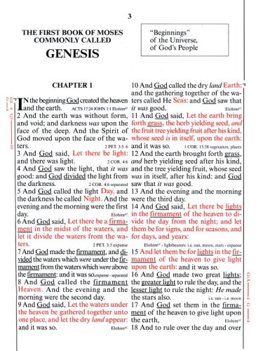 In the New Testament, the traditional color scheme is used, denoting the words of Christ in red. Here citations of the direct words of God from the Old Testament have been encircled in red. Likewise, quotations of the words of God or of Christ by others have been encircled in red.