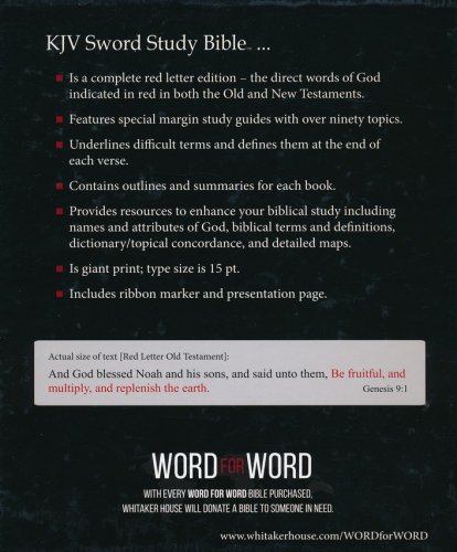 Complete Red Letter edition—the only Bible with God's spoken words in red in both TestamentsThematic study guide with over 3,000 margin notes covering more than 90 topics providing a years' worth of study that takes youi from cover to cover of the BibleExtensive topical concordance–indexes topics as well as wordsDifficult terms underlined and defined at the end of the verseOutlines and summaries at the beginning of each bookAn extensive Treasury of Biblical Information on history, science, prophecy, and moreEight pages of mapsPresentation pageRibbon markerGold page edgesLarge 15-point text size9.75 x 7.75" x 2.00"