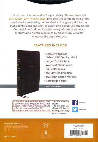 Presentation page allows you to personalize this special gift by recording a memory or noteWords of Christ in red quickly identify verses spoken by JesusReading plan guiding you through the entire Bible in a year30 days with Jesus call out important events during Jesus’ earthly ministryFull color maps show a visual representation of Israel and other biblical locations for better contextSatin Ribbon Markers are a useful tool to easily navigate and keep track of where you were readingEasy-to-read line-matched giant 12-point KJV Comfort Print