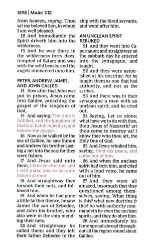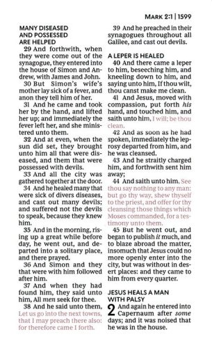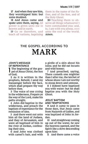 Convenient personal size (5" x 8") to easily carry anywhere you goVerse-by-verse format starts each verse on its own line so it’s easy to navigate the textClassic double-column layout for a clean uncluttered Bible reading experience8-pages of full-color maps show the layout of Israel and other biblical locations for better contextRed satin ribbon marker to easily navigate and keep track of where you are readingWords of Christ in redClear and readable 12-point KJV Comfort Print®