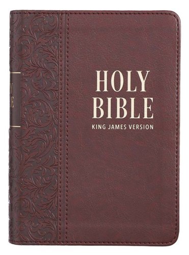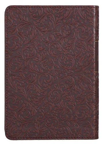 This beautifully classic King James Version Bible is an excellent choice for a gift to a beloved grandfather or father. Because of its compact size, it makes a great travel Bible for people always on the go. The medium brown imitation leather cover is heat debossed with a continuous leaf design that starts on the back cover and wraps around the spine where it is attached to a smooth front panel with a double row of brown topstitching. The smooth panel on the front holds the gold foiled title. The title and version reference are also repeated on the spine in gold foil.