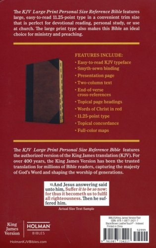 The KJV Large Print Personal Size Reference Bible features large, easy-to-read 11.5-point type in a convenient trim size that is perfect for devotional reading, personal study, or use at church. The large print type also makes this Bible an ideal choice for ministry and preaching.