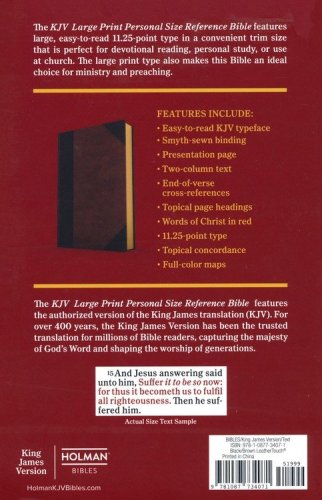 The KJV Large Print Personal Size Reference Bible includes a large, easy-to-read 11.5-point KJV typeface in a convenient trim size that is perfect for devotional reading, personal study, or use at church. The large print type also makes this Bible an ideal choice for ministry and preaching.