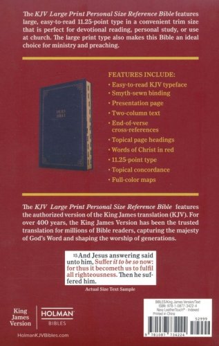 The KJV Large Print Personal Size Reference Bible features large, easy-to-read 11.5-point type in a convenient trim size that is perfect for devotional reading, personal study, or use at church. The large print type also makes this Bible an ideal choice for ministry and preaching.