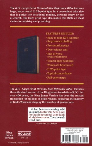 The KJV Large Print Personal Size Reference Bible includes a large, easy-to-read 11.5-point KJV typeface in a convenient trim size that is perfect for devotional reading, personal study, or use at church. The large print type also makes this Bible an ideal choice for ministry and preaching.