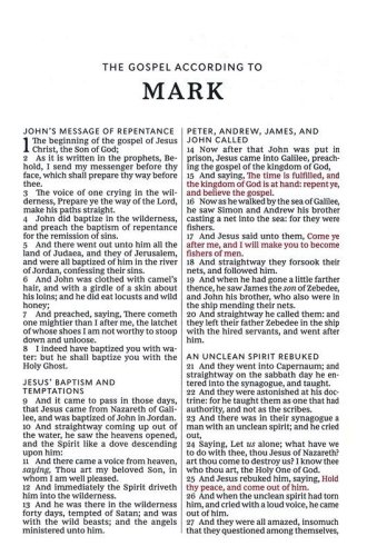 Presentation page allows you to personalize this special gift by recording a memory or noteWords of Christ in red quickly identify verses spoken by JesusReading plan guiding you through the entire Bible in a yearFull color maps show a visual representation of Israel and other biblical locations for better contextSatin Ribbon Markers are a useful tool to easily navigate and keep track of where you were readingEasy-to-read line-matched large 11.5-point KJV Comfort Print