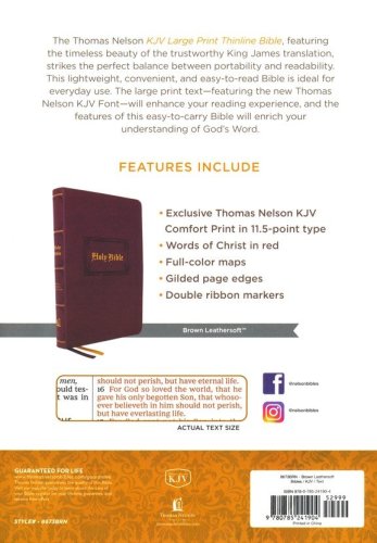 This edition of the Holy Bible strikes the perfect balance between portability and readability. Wherever you’re going, the KJV Thinline Large Print Bible is built to travel with you. Plus, Comfort Print® KJV Bibles from Thomas Nelson use an exceptionally easy-to-read text design that reflects the Bible's beautiful and timeless character, enhancing your reading experience.