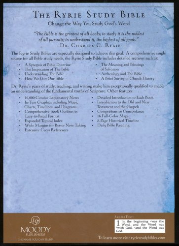 Since its initial publication in 1978, The Ryrie Study Bible has sold more than 2.6 million copies, giving countless Bible readers a firmer grasp on "the greatest of books." Available in multiple translations and containing more than 10,000 of Dr. Ryrie’s explanatory notes, it is a single source for all Bible study needs.