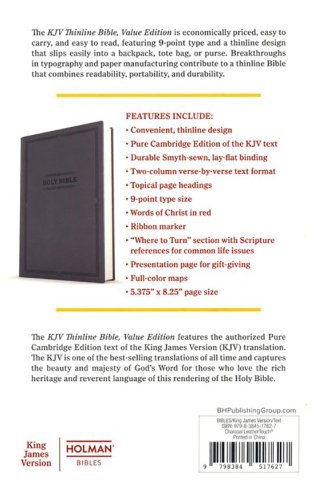 The KJV Thinline Bible, Value Edition is economically priced, easy to carry, and easy to read, featuring 9-point type and a thinline design that slips easily into a backpack, tote bag, or purse. Breakthroughs in typography and paper manufacturing contribute to a thinline Bible that combines readability, portability, and durability.