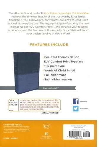 The Thomas Nelson KJV Thinline Bible, Large Print featuring the timeless beauty of the King James translation in Thomas Nelson’s new KJV Comfort Print® fonts, is lightweight and convenient for everyday use. Striking the perfect balance between portability and readability, the KJV Thinline Bible, Large Print offers a large print text so you can increase your engagement with Scripture.