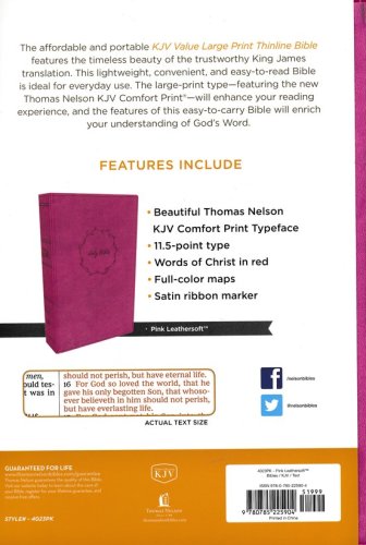 The Thomas Nelson KJV Thinline Large Print Bible—featuring the timeless beauty of the trustworthy King James translation in a large, readable font size—strikes the perfect balance between portability and readability. Wherever you’re going, the KJV Thinline Large Print Bible is built to travel with you. This easy-to-carry Bible comes with features that will enhance your reading experience, including beautifully-designed covers, an all-new typesetting in the elegant and readable Thomas Nelson KJV font, double ribbon markers, and the words of Christ in red.