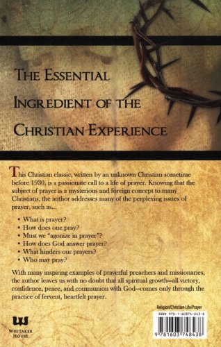 This Christian classic, written by an unknown Christian sometime before 1930, is a passionate call to a life of prayer. Knowing that the subject of prayer is a mysterious and foreign concept to many Christians, the author addresses many of the perplexities of this practice, such as…What is prayer?How does one pray?Must we "agonize in prayer"?How does God answer prayer?What hinders our prayer?Who may pray?With many inspiring examples of prayerful preachers and missionaries, the author leaves no doubt that all spiritual growth—all victory, confidence, peace, and communion with God—comes only through the practice of fervent, heartfelt prayer.