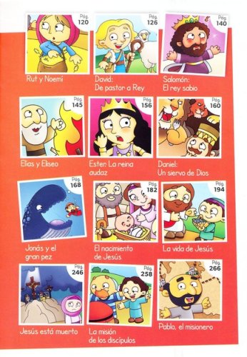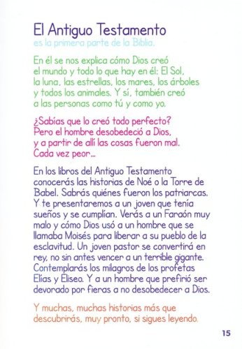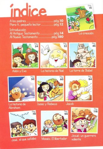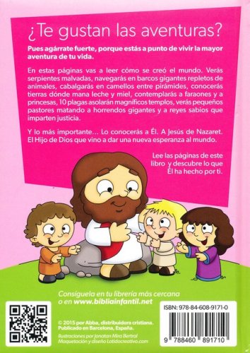 ¿Te gustan las aventuras? Pues agárrate fuerte, porque estás a punto de vivir la mayor aventura de tu vida. En estas páginas vas a leer cómo se creó el mundo. Verás serpientes malvadas, navegarás en bargos gigantes repletos de animales, cabalgarás en camellos entre pirámides, conocerás tierras dónde mana leche y miel, contemplarás a faraones y a princesas, 10 plagas asolarán magnificos templos, verás pequeños pastores matando a horrendos gigantes y a reyes sabios que impartan justicias. Y lo más importante… Lo conocerás a El. A Jesús de Nazaret, El Hijo de Dios que vino a dar una nueva esperanza al mundo. Lee las páginas de este libro y descubre lo que El ha hecho por tí. Edició de niñas.