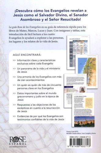 ¡Observe cómo todo en los Evangelios revela a Jesús como el divino Mesías, Salvador, Siervo, Sanador y Señor Resucitado! La guía Rose de los Evangelios es su guía de referencia rápida para los libros de Mateo, Marcos, Lucas y Juan. Con más de 100 imágenes, tablas y líneas de tiempo, esta accesible introducción a los cuatro Evangelios le ayudará a explorar más de 150 personas, lugares e historias claves en la vida de Jesús. Agrégele profundidad a cualquier estudio bíblico con resúmenes detallados de cómo se escribieron los Evangelios, de las personas y los eventos claves en cada uno de los cuatro libros, de por qué puede confiar en ellos, de cómo cumplió Jesús las profecías del Antiguo Testamento y ¡de mucho más! Incluye lo siguiente:Una introducción a la cultura y las costumbres judías y grecorromanas en la época de Jesús.Un panorama de la vida de Jesús: por qué vino, qué hizo y por qué es relevante para nosotros hoy en día.El quién, qué, dónde, cuándo y por qué de los cuatro Evangelios. Compare cómo estos cuatro libros son similares y cómo difieren.Un análisis profundo de cómo se escribieron los Evangelios. Entenderá por qué los Evangelios son testimonios confiables de la vida y la obra de Jesucristo.Sobre la serie: Las guías Rose son guías de referencia fáciles de leer que exploran las personas, los lugares y las historias de la Biblia. Con mapas a todo color, tablas y líneas de tiempo que caracterizan a Rose Publishing, las guías Rose les proveen a los lectores revelaciones claves tanto históricas como prácticas para entender los libros de la Biblia y los temas bíblicos que son relevantes para nuestra vida hoy en día.