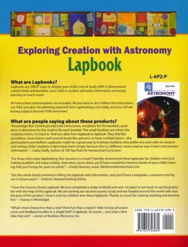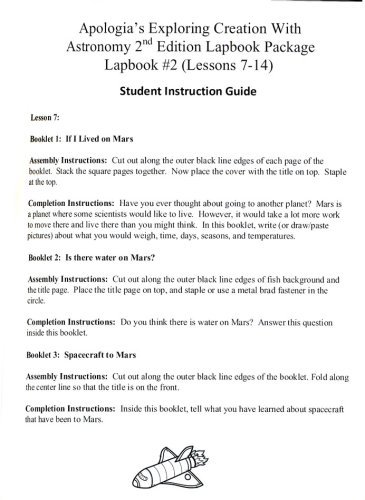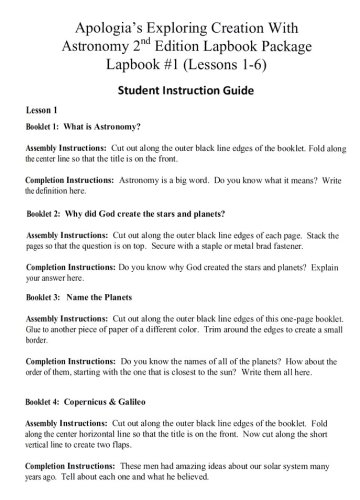 Create your own lapbook with this pre-printed, do-it-yourself format. This notebook covers all lessons 1-14 of the sold-separately Apologia Exploring Creation with Astronomy, 2nd Ed The Lapbook Assembly Guide provides instructions and diagrams on assembling the lapbook, and where to glue each booklet. The Student Instruction Guide is written directly to the student and provides information on what should be written inside each booklet and to what folder it should be glued. The Teacher's Guide section features page numbers for where answers may be found in the textbook and suggestions of extra activities. The included Booklet Templates includes all of the booklet templates; they have been printed on colors thought to improve retention of information presented. Softcover.