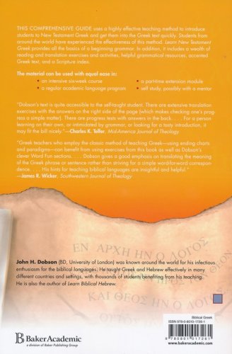 Now available in paperback, this comprehensive guide uses a highly effective teaching method to introduce readers to New Testament Greek quickly. The book provides all the basics of a beginning grammar. In addition, it includes a wealth of reading and translation exercises and activities, helpful grammatical resources, and accented Greek text.