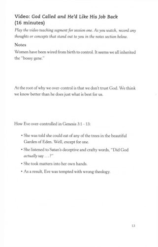 In this humorous, yet thought-provoking small group Bible study you’ll find the freedom and reward of living "out of control" – putting God in the rightful place he deserves in your life. Armed with relevant biblical and current examples (both to emulate and to avoid), doable ideas, new thought patterns, and practical tools to implement, this study will gently lead you out of the land of over-control and into a place of quiet trust.