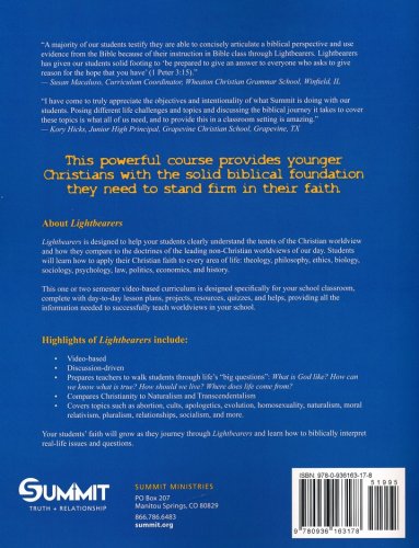 This newly revised third edition of Lightbearers: A Biblical Worldview Curriculum Student Workbook contains fill-in-the-blank notes for each video segment, as well as readings on various topics to help the student gain a deeper grasp of worldview thinking and application. This manual provides each student with a complete set of notes and outlines for various assignments, discussions, and test reviews.