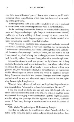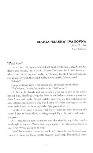 A story of Ukraine’s tragedies through the eyes of four characters who experience the same story from different perspectives. Maria Ivanovna a fourteen year old forced to work in a German labor camp. Ivan Kyrilovich, survives after having been mistaken as a Jew and lined up with 34,000 others to be shot at the edge of a killing ditch. Luda is sixteen abused by soldiers, now pregnant with the enemy’s child and then abandoned by her father. Fredrick Hermann believes in the ideals of Nazism.