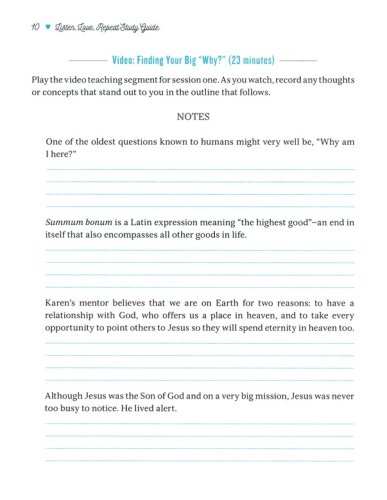 The Listen, Love, Repeat Study Guide includes video notes, group discussion questions, individual activities, Scripture memory verses, and between-sessions personal studies.