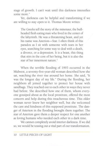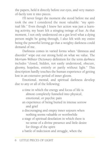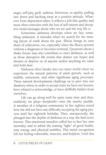 Little Pieces of Light is a hope-filled book that reaches into the human heart and encourages the reader to approach painful inner darkness as a help rather than a hindrance for personal growth.
