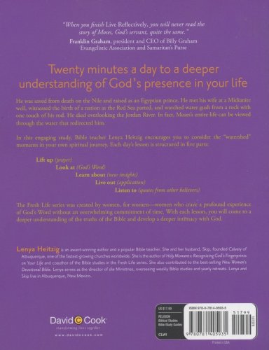 Twenty minutes a day to a deepter understanding of God's presence in your life  He was saved from death on the Nile and raised as an Egyptian prince. He met his wife at a Midianite well, witnessed the birth of a nation as the Red Sea parted, and watched water gush from a rock with one touch of his rod. He died overlooking the Jordan River. In fact, Moses’s entire life can be viewed through the water that redirected him. In this engaging study, Bible teacher Lenya Heitzig encourages you to consider the "watershed" moments in your own spiritual journey. Each day’s lesson is structured in five parts: Lift up (prayer), Look at (God’s Word) , Learn about (new insights), Live out (application), Listen to (quotes from other believers) The Fresh Life series was created by women, for women—women who crave a profound experience of God’s Word without an overwhelming commitment of time. With each lesson, you will come to a deeper understanding of the truths of the Bible and develop a deeper intimacy with God.