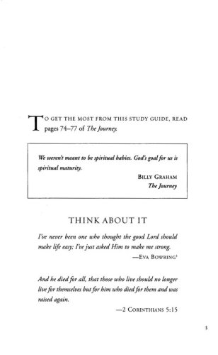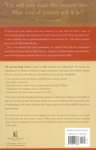 Is your love for other believers growing? Is your faith in God a topic of conversation among other believers? Is God's work you work? If you can answer "yes" to these questions, you are growing spiritually. If you answered "no", your road to spiritual growth may be filled with obstacles. Just as our physical lives need nourishment, our spiritual lives need the nourishment provided by Scripture and our fellow believers. Living as a Christina explores ways to become aware of God's presence and direction in every step on our journey of life. The Journey Study Series is based on Billy Graham's best-selling book The journey, the culmination of lifetime of spiritual insight and ministry experience. Each chapter explores the joys, triumphs, and conflicts we all encounter on our journey through life.Use for self-study or shared experiences in small groupssix weeks of lessonssidebars offer a scriptural journey through God's wordquestions for starting group discussionsinsight-filled scripture passages to studyEach chapter includes thought-provoking questions, commentary, Scriptures, and insights to help you on life's journey. Each lesson teaches the secret of walking with God on life's path. Understanding God's truths will make life's journey easier and let Him fulfill His promise to lead you home.