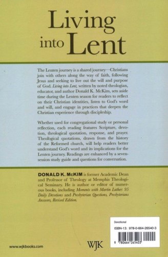 The Lenten journey is a shared journey-Christians join with others along the way of faith, following Jesus and seeking to live out the will and purpose of God. Living into Lent, written by noted theologian, educator, and author Donald K. McKim, sets aside time during the Lenten season for readers to reflect on their Christian identities, listen to God's Word and will, and engage in practices that deepen the Christian experience through discipleship.