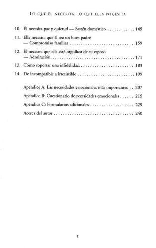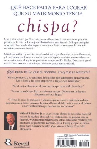 Marriage works only when each spouse takes the time to consider the other's needs and strives to meet them. In Lo que él necesita, lo que ella necesita, Willard Harley identifies the ten most vital needs of men and women and shows husbands and wives how to satisfy those needs in their spouses. He provides guidance for becoming irresistible to your spouse and for loving more creatively and sensitively, thereby eliminating the problems that often lead to extramarital affairs.