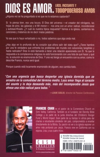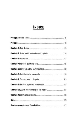 Dios lo está llamando a una apasionada relación con Él. ¡El Dios del universo, el Creador, está loco por usted! Francis Chan comparte sus propias luchas y sacrificios, y hace un llamado urgente a vivir una vida totalmente desprendida como la que vivió Jesús. Chan reta a cada lector a tomar en serio y conciencia de la Biblia. Él describe el lamentable estado de tibieza de los cristianos que luchan por una vida en donde impera el control, la seguridad y falta de sufrimiento. En contraste, este libro ofrece relatos y hechos reales de cristianos que lo dieron todo: tiempo, dinero, salud e inclusive su propia vida en total rendimiento y obediencia tras el llamado de Cristo.