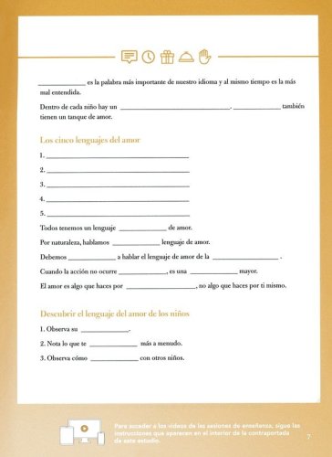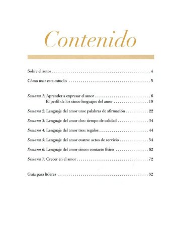 Siete semanas de estudio para parejas y grupos.Ayudas para el líder, incluyendo guías de preguntas y sugerencias para la discusión en grupos pequeños.Perfil interactivo de lenguaje de amor.Siete videos de enseñanza de 15 a 35 minutos por sesión, disponibles mediante un código de redención impreso en el libro de estudio bíblico para acceso individual a la transmisión en línea.