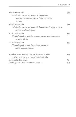 "Los libros largos parecen desalentadores porque pensamos que debemos comenzar por el principio y leer hasta el final y no saltarnos nada. No espero que la mayoría de la gente lea este libro de esa manera. Estructuré este libro de modo que los asuntos del principio puedan ayudar al lector a comprender los asuntos posteriores. Y hay una especie de fundamento, progresión y clímax. Pero los capítulos tienen suficiente independencia como para que la mayoría de ellos puedan leerse sin los demás. Será obvio cuando un capítulo dependa de otro. Por eso, te invito a intervenir en cualquier lugar. No es necesario que leas la Introducción primero. Espero que la forma en que se entrelazan los mandamientos de Jesús le acerque más, de un tema a otro." —John Piper