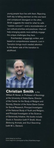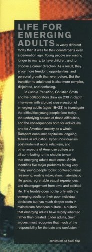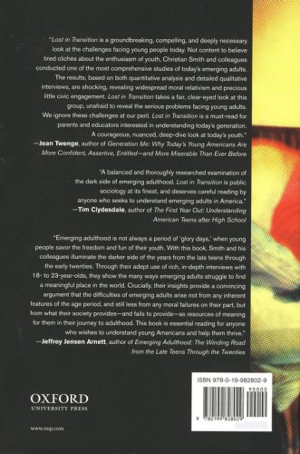 In Lost in Transition, Christian Smith and his collaborators draw on 230 in-depth interviews with a broad cross-section of emerging adults (ages 18-23) to investigate the difficulties young people face today, the underlying causes of those difficulties, and the consequences both for individuals and for American society as a whole. Rampant consumer capitalism, ongoing failures in education, hyper-individualism, postmodernist moral relativism, and other aspects of American culture are all contributing to the chaotic terrain that emerging adults must cross. Smith identifies five major problems facing very many young people today: confused moral reasoning, routine intoxication, materialistic life goals, regrettable sexual experiences, and disengagement from civic and political life. The trouble does not lie only with the emerging adults or their poor individual decisions but has much deeper roots in mainstream American culture–a culture which emerging adults have largely inherited rather than created. Older adults, Smith argues, must recognize that much of the responsibility for the pain and confusion young people face lies with them. Rejecting both sky-is-falling alarmism on the one hand and complacent disregard on the other, Smith suggests the need for what he calls "realistic concern"–and a reconsideration of our cultural priorities and practices–that will help emerging adults more skillfully engage unique challenges they face.