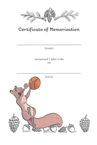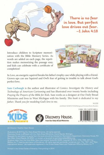In Love: A Bible Memory Book an energetic squirrel breaks his father's trophy case while playing with a friend. When his dad later spears, both young ones learn: There is no fear in love. But perfect love drives out fear. 1 John 4:18 (NIV)