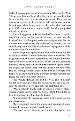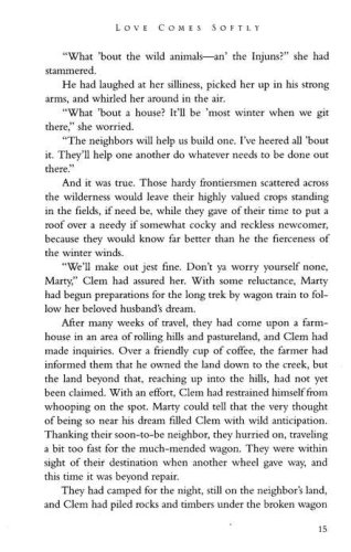 Love Comes Softly introduced the characters of Marty and Clark Davis, whose tragic circumstances brought them to a "marriage of convenience" on the frontier prairies during the mid 1800s. The story of how Clark's patient, caring love mirrored that of the heavenly Father, drawing Marty to faith and to love, has captured the hearts and imaginations of over one million readers on Book One alone!