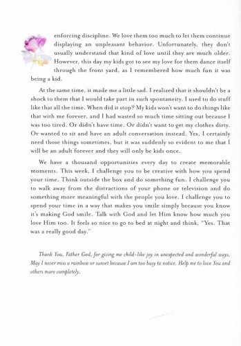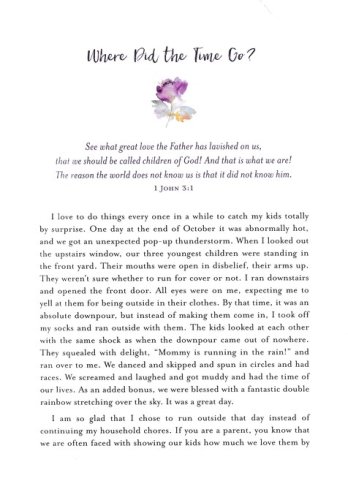 Devotional entries by Denae Jones illustrate how the fruit of the spirit can be found in every day life. The prompts and questions lead into pages for journaling. Devotions are included for each of the fruit described in Galatians 5: love, joy, peace, patience, kindness, goodness, gentleness, faithfulness, and self-control.