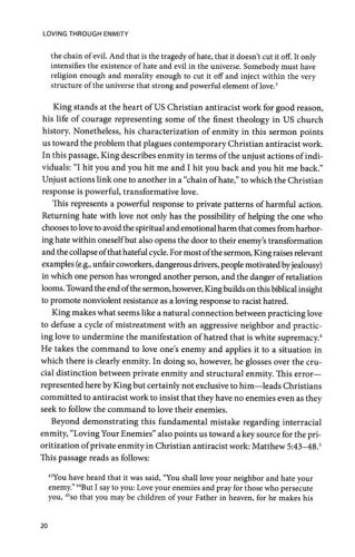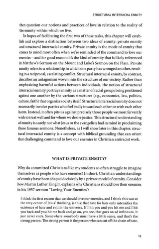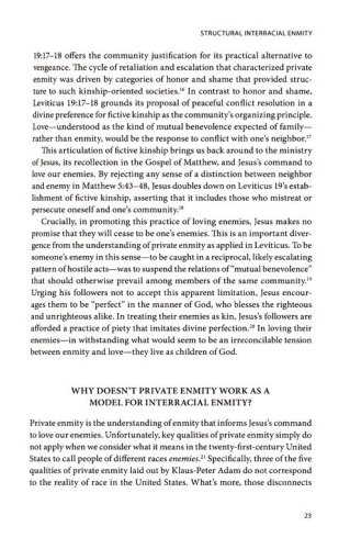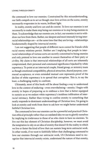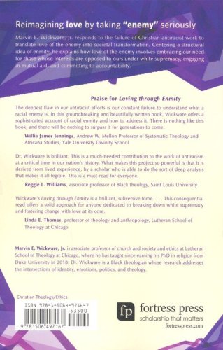 Loving through Enmity responds to the failure of US Christian antiracist work to translate love of the enemy into meaningful societal transformation. Beginning with an analysis of the racial enmity that is fundamental to white supremacy, Wickware clarifies an oft-elided distinction between private and structural enmity. While systemic opposition of interests between white and BIPOC Christians is the core enmity at play in white supremacy, Christian antiracist work too often centers individual slights, struggles, and forgiveness.