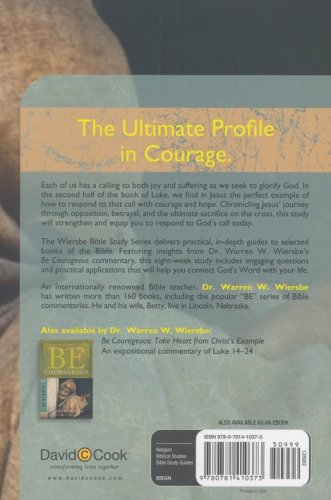 The Ultimate Profile in Courage Each of us has a calling to both joy and suffering as we seek to glorify God. In the second half of the book of Luke, we find in Jesus the perfect example of how to respond to that call with courage and hope. Chronicling Jesus’s journey through opposition, betrayal, and the ultimate sacrifice on the cross, this study will strengthen and equip you to respond to God’s call today. The Wiersbe Bible Study Series delivers practical, in-depth guides to selected books of the Bible. Featuring insights from Dr. Warren W. Wiersbe’s Be Courageous commentary, this eight-week study includes engaging questions and practical applications that will help you connect God’s Word with your life.
