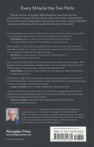 Popular author and pastor Mike Slaughter examines the two components of every miracle: divine action and human responsibility. For a real miracle to take place, we must act with God, using whatever gifts, talents, and abilities we have and directing them toward God’s work. We need to follow the examples of Mary in the birth of Jesus, Jesus’ followers when he healed them, and Jesus’ disciples after he rose from the dead.