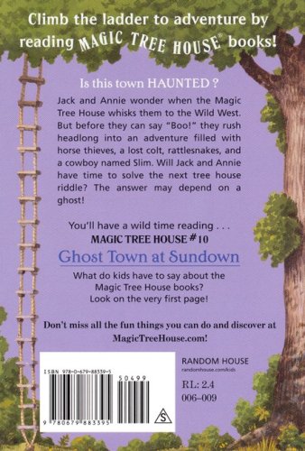 Is this town HAUNTED? Jack and Annie wonder when the Magic Tree House whisks them to the Wild West. But before they can say "Boo!" they rush headlong into an adventure filled with horse thieves, a lost colt, rattlesnakes, and a cowboy named Slim. Will Jack and Annie have time to solve the next Tree House Riddle? The answer may depend on a ghost!