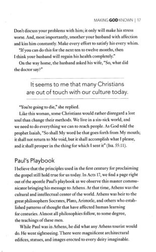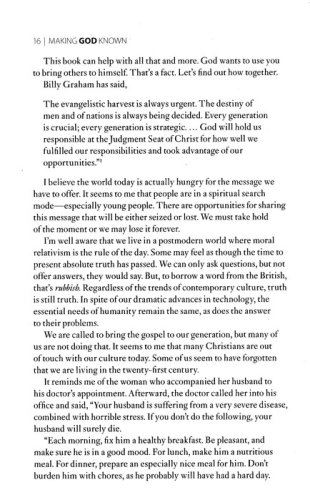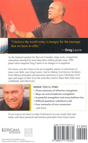 "I believe the world today is hungry for the message that we have to offer." – Greg LaurieAs the featured speaker for Harvest Crusades, large-scale, evangelistic outreaches attended by more than three million people since 1990, pastor and evangelist Greg Laurie is no stranger to evangelism.Of course, you don't have to be an evangelist, pastor, or missionary to share your faith, says Greg Laurie. And in Making God Known, he draws from biblical principles and personal experience to give Christians of all ages and stages of their lives the tools they need to share their faith more confidently and effectively. Inside You'll Find: – Three elements of effective evangelism- Ways we overcomplicate evangelism- A powerful evangelism tool every believer has- Difficult questions unbelievers ask- Four earmarks of true conversion…. and more.If you want to do more to make God known in your world, then start today with these practical and timeless principles from Greg Laurie.
